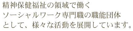 私たち精神保健福祉士は、精神障害者の社会的復権・権利擁護と福祉のための専門的・社会的活動を行う専門職として日々活動しています。また、広く地域の精神保健保持のために、医療、保健、福祉にまたがる領域で専門的な活動をしています。このような活動が認知され信頼されていくためには、専門職として研鑽の機会を多く持ち、質を高めていくこと仲間との情報交換・ネットワークを構築し、つながりと連携を強固にしていくこと関係団体や関係機関と連携・協力を図ること社会の要請や期待に応え、社会的発信力を高めていくことが求められています。