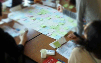 当日は19名の方に参加していただきました。普段業務で顔を合わせる方もいれば、初めてお会いする方もおり、やはり、普段の業務内容や悩みも様々でした。ワールドカフェの手法にのっとり、参加者は旅人のように、テーブルを渡り歩きながら、名刺交換をしつつ、自由に語り合いました。どのテーブルからも時折笑いがおき、とても良い雰囲気で会が進行されました。終了後、テーブルの模造紙には斬新でユニークなアイディアが残りました。
