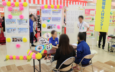 今年は公的機関、企業、福祉施設など、様々な方からご協力を頂き、4つのブース(ソーシャルワーカー紹介、福祉の資格と仕事紹介、福祉体験、イベントコーナー)を展開しました。ソーシャルワーカーとはどんな仕事をする人なのか?どこで働いているのか?資格は?給与は?求人は?やりがいは?など様々な視点から、ソーシャルワーカーを身近に感じてもらうことを目的に活動しました。当日は、学生や家族連れの方など約600名が来場され、会場は大盛況でした。今後も4団体が共同し、地域に対する働きかけを継続していきたいと思います。